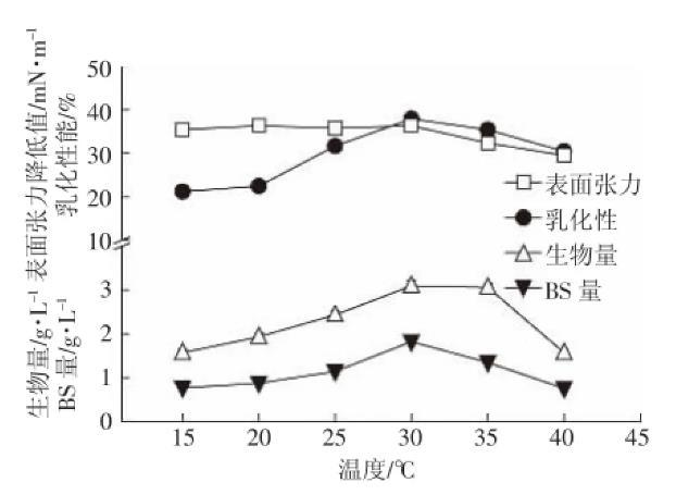 溫度是影響菌株發(fā)酵產(chǎn)物產(chǎn)量的重要環(huán)境因素之一。不同細(xì)菌的最適生長溫度不同。一般細(xì)菌在4℃停止生長,在30℃左右生長良好。已報(bào)道的銅綠假單胞菌(Pseudomonas aeruginosa)最適溫度一般在27~37℃。由圖4可以看到,表面張力值、生物量和生物表面活性劑產(chǎn)量都隨著溫度的升高呈現(xiàn)先升高后降低的趨勢(shì),在30℃時(shí)達(dá)到最大。乳化性在15℃到30℃時(shí)保持相對(duì)穩(wěn)定,在30℃到40℃時(shí)乳化性降低。實(shí)際上大多數(shù)銅綠假單胞菌的最佳培養(yǎng)溫度都在27~37℃,與實(shí)驗(yàn)結(jié)果相符。