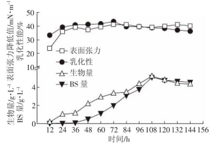 在上述花生油25 mL·L-1為碳源、硫酸銨1 g·L-1為氮源、NaCl濃度為5 g·L-1、pH=8、溫度保持為30℃的最佳培養(yǎng)條件下,追蹤細(xì)菌147的發(fā)酵動(dòng)態(tài)(圖7)。菌株經(jīng)過短暫的延滯期后進(jìn)入對(duì)數(shù)生長期,108 h后進(jìn)入穩(wěn)定增長期,此時(shí)菌體所產(chǎn)生的生物表面活性劑含量達(dá)到最大,此后生物表面活性劑含量減少,可能是因?yàn)楹笃谂囵B(yǎng)基內(nèi)的碳源已經(jīng)用盡,細(xì)菌開始以胞外分泌物糖脂為碳源維持生命。而表面張力值與乳化性在24 h后達(dá)到最大,之后維持在穩(wěn)定水平,說明細(xì)菌在24 h后產(chǎn)生的生物表面活性劑已到達(dá)生物表面活性劑的臨界膠束濃度,此后生物表面活性劑產(chǎn)量還會(huì)增加,但是表面張力降低值與乳化性只維持在一定范圍內(nèi)波動(dòng)。