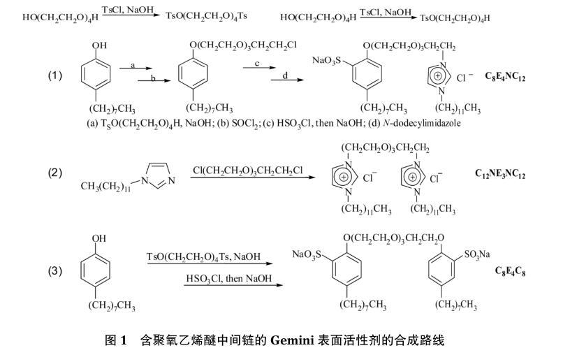 Gemini表面活性劑是具有雙親水雙親油特殊結構的一類表面活性劑,因其結構的特殊性和分子結構設計的多樣性,使其在性質(zhì)和應用方面有別于其他表面活性劑,具有表面活性更高,臨界膠束濃度(cmc)更低等特點。