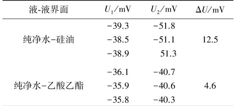 實驗測量所用金屬吊環(huán)的外徑、內(nèi)徑分別為0.034 96 m和0.033 10 m.在20℃實驗條件下,采用自制2種液體間界面張力的動態(tài)實時測量儀,測量了純凈水-硅油和純凈水-乙酸乙酯間的界面張力.測量出金屬吊環(huán)由液體I中完全進入液體Ⅱ的過程中,液體I的液膜被拉斷前電壓的最大值U1,拉斷后趨于穩(wěn)定時的電壓值為U2,數(shù)據(jù)結(jié)果如表1所示.