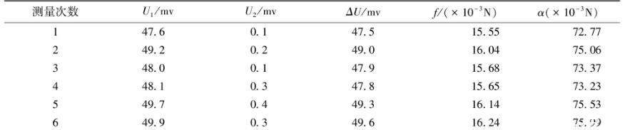 根據(jù)測(cè)量數(shù)據(jù),計(jì)算得出用改進(jìn)后吊環(huán)測(cè)出的純水在25℃時(shí)液體的表面張力系數(shù)平均值是71.79×10-3N/m,在25℃時(shí)純水的液體表面張力系數(shù)公認(rèn)值為72.00×10-3N/m,相對(duì)誤差為0.3%。
