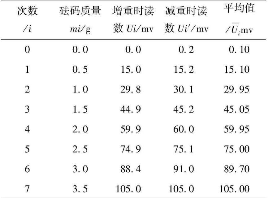 對(duì)于力敏傳感器靈敏度的測(cè)量,保持不增加實(shí)驗(yàn)成本的原則,采用多次測(cè)量,先依次增加片碼個(gè)數(shù),再依次減少片碼個(gè)數(shù)的方法平均人為誤差,然后用逐差法求得力敏傳感器的靈敏度,具體測(cè)量數(shù)據(jù)如表1所示。