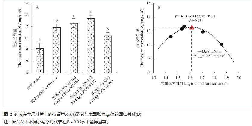 為探索藥液表面張力與藥液在蘋果葉片表面最大持留量的關(guān)系,將各處理藥液表面張力(γ)取l g值后與對應的最大持留量Rm作圖并進行了回歸分析,如圖2-B??梢钥闯觯篟m隨著γ增大呈現(xiàn)出先增大后迅速降低的趨勢,二者之間存在拋物線狀函數(shù)關(guān)系,滿足二次多項式y(tǒng)=?41.48x2+133.7x?95.21,R2為0.95。根據(jù)曲線預測,當藥液γ為40.89 mN/m時,藥液在蘋果葉片上最大持留量Rm達最大值12.53 mg/cm2。該結(jié)果可應用于成熟“富士”蘋果園,在果實膨大后期病蟲害化學防治中,可利用助劑調(diào)控藥液的表面張力使藥液達到最大持留。