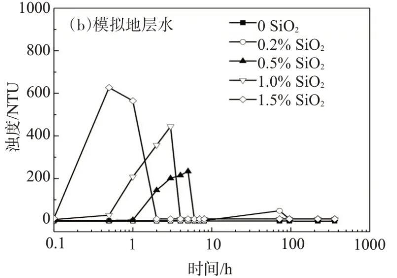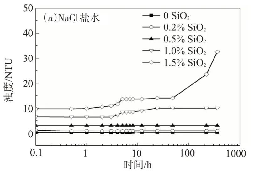 用模擬地層水配制的納米SiO2/SDS體系經(jīng)歷了澄清透明-渾濁-沉降的3個(gè)階段,靜置初始,納米SiO2質(zhì)量分?jǐn)?shù)為0.5%的體系的濁度不隨時(shí)間的延長而變化,表明此時(shí)體系穩(wěn)定;靜置1 h后,濁度明顯增加;靜置6 h后,體系的濁度又恢復(fù)到了初始值,由于實(shí)驗(yàn)測試的是樣品上半部分的濁度,說明此時(shí)體系已經(jīng)完全沉降。