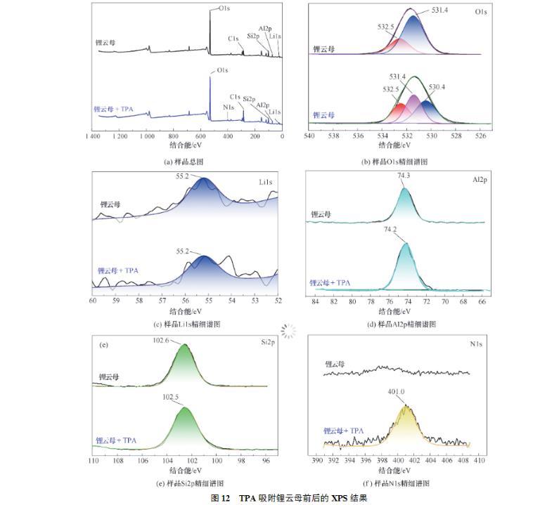 (2)接觸角試驗表明,同等條件下,TPA作用鋰云母的接觸角總是大于DDA,展現(xiàn)了TPA更強的疏水性。Zeta電位測試結(jié)果表明,TPA及DDA在鋰云母表面的吸附為靜電吸附,并且碳鏈更長的TPA由于疏水效應吸附性更好,進一步證明了TPA的強疏水性。FTIR及XPS進一步證實了TPA吸附在鋰云母表面。