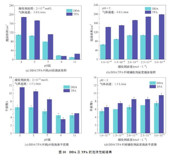 (3)在不同濃度下,TPA均得到比DDA更低的表面張力,說明TPA可能具有更多的泡沫容積,泡沫容積結(jié)果驗證了表面張力結(jié)果。在不同濃度下,TPA均得到比DDA更高的黏度,說明TPA產(chǎn)生的泡沫更穩(wěn)定,泡沫半衰期結(jié)果驗證了黏度結(jié)果。表面張力試驗、黏度試驗、泡沫容積試驗、泡沫半衰期試驗共同證明TPA更優(yōu)越的泡沫性能。將TPA應用于浮選中,能夠增大氣泡與鋰云母的碰撞及接觸概率,增強鋰云母與氣泡的黏附,減少鋰云母與氣泡的脫附,進而提高浮選回收率。