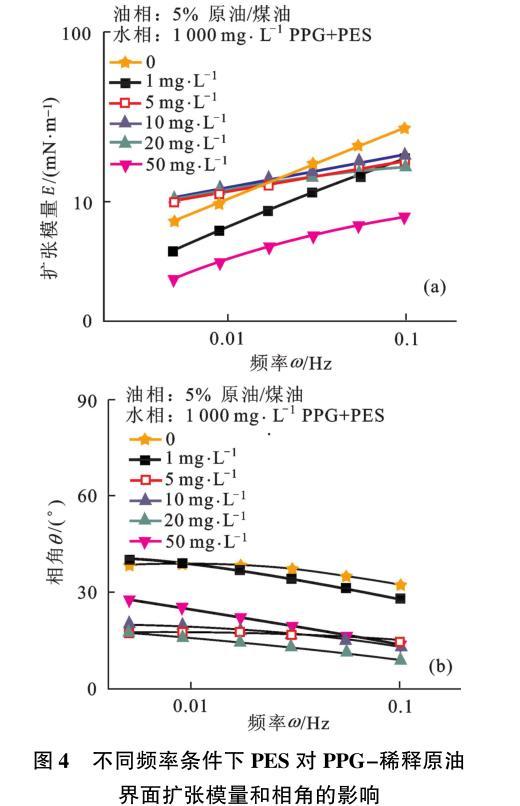 圖4不同頻率條件下PES對PPG-稀釋原油界面擴(kuò)張模量和相角的影響