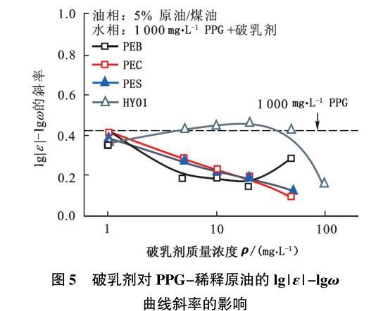 圖5破乳劑對PPG-稀釋原油的lg|ε|-lgω曲線斜率的影響