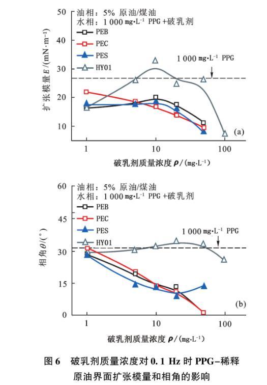 圖6破乳劑質(zhì)量濃度對0.1 Hz時PPG-稀釋原油界面擴(kuò)張模量和相角的影響