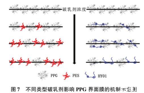 圖7不同類型破乳劑影響PPG界面膜的機(jī)制示意圖