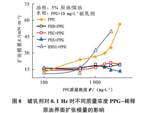 圖8破乳劑對0.1 Hz時不同質(zhì)量濃度PPG-稀釋原油界面擴(kuò)張模量的影響