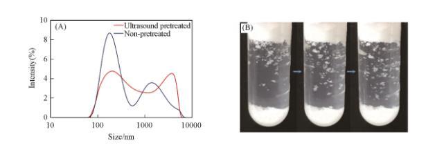 值得注意的是,如果粒子首先用超聲波分散在液體中,然后以相同的方式振蕩,則顆粒產(chǎn)生的泡沫高度有所下降[圖6(A)]。因此對比了振蕩和超聲波處理后的顆粒在液體中團聚體的粒徑大小。采用動態(tài)光散射儀間接表征了顆粒在液體中的團聚情況[圖7(A)]??梢钥闯?,振蕩后的液體中有較多物質(zhì)的粒徑大于單個顆粒直徑,而且粒徑分布很寬。這證明液體中存在明顯的顆粒團聚體。由于顆粒本身存在巨大的表面能,多數(shù)顆粒在空氣中已經(jīng)自發(fā)團聚。顆粒在液體中大多也以團聚體的方式存在。少量空氣被密封在浸沒于油相中的顆粒團聚體內(nèi)部,這部分不與外界聯(lián)通的空氣提供了額外的壓力,進而阻止了進一步滲透。這種顆粒團聚體表面同樣形成了由Cassie-Baxter方程描述的復合表面,該復合表面的形成保護了構(gòu)成團聚體的顆粒不被完全潤濕,并使團聚體表面具有合理的疏油性(cosθ_CB的值接近0),從而在熱力學上團聚體便于發(fā)生吸附。而溶液經(jīng)超聲波處理后顆粒被潤濕,團聚體被破壞使尺寸變小,并且均勻分布在溶液中。圖6(B)顯示了在經(jīng)超聲波處理后的表面張力測試數(shù)據(jù),同樣表明團聚體被破壞后,被潤濕的顆粒不再傾向于吸附在表面上。