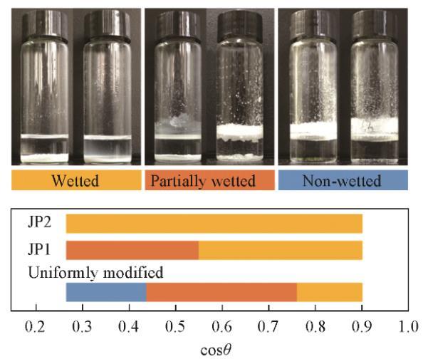 放置在靜止液體表面的顆粒的潤濕行為由圖5示出。隨著液體表面張力的增加,從光滑的氟碳鏈覆蓋的表面獲得的cosθ值同時增大,液體頂部的表面出現(xiàn)明顯的不溶顆粒。這種顆粒不潤濕的情況與顆粒形成粗糙表面測量的結(jié)果具有相關性。干燥的顆粒以蓬松狀態(tài)直接向油相傾倒,如果在油相表面能形成足夠強壯的、由顆粒組成的亞穩(wěn)態(tài)Cassie-Baxter狀態(tài),那么疏油表面將會形成,并阻止其它顆粒接觸油相,宏觀表現(xiàn)為顆粒不潤濕。相反,如果油相表面由顆粒組成的亞穩(wěn)態(tài)Cassie-Baxter狀態(tài)魯棒性不足,在手動振蕩或重力作用下,顆?;蝾w粒團聚體接觸油相并浸沒在油相中。亞穩(wěn)態(tài)魯棒性與顆粒表面材料潤濕角密切相關,即不同類型的顆粒具有明顯不同的潤濕轉(zhuǎn)折點。JP1潤濕性轉(zhuǎn)折點位于均勻修飾顆粒右側(cè),JP2沒有發(fā)現(xiàn)潤濕轉(zhuǎn)折點。這與顆粒上接枝的烷烴鏈數(shù)量有關。JP2上盡管存在氟碳鏈,但由于烷烴鏈覆蓋的面積太大,使顆粒整體表現(xiàn)出強烈的親油性。