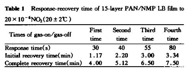 在恢復(fù)的初期,吸附在敏感膜表面上的NO?氣體分子將發(fā)生較快的脫附;而在隨后直至完全恢復(fù)的這段較長的時間里,擴散進(jìn)敏感膜體內(nèi)的NO?分子將發(fā)生非常復(fù)雜的脫附過程:在LB膜和NO?氣體之間的吸附與脫附作用是一個動態(tài)過程,脫附的NO?分子又有可能吸附于LB膜表面或擴散進(jìn)膜內(nèi)部,尤其隨著通氣與排氣的次數(shù)增加,這種情況就更加復(fù)雜。