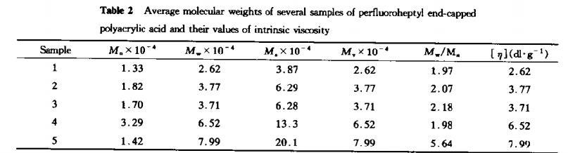 全氟庚雙酰過氧化物的熱分解屬于一級動力學(xué)反應(yīng),熱分解生成的全氟庚烷基自由基是一個非?;顫姷淖杂苫梢l(fā)丙烯酸(AA)在較低溫度下聚合,但產(chǎn)率較低,如表1所示。GPC分子量測定結(jié)果(表2)表明,隨丙烯酸與全氟庚基摩爾比增加,產(chǎn)物分子量相應(yīng)增加,在低摩爾比情況下,多分散指數(shù)約在2左右,而高摩爾比時,分子量分布更寬,其多分散指數(shù)高達5以上。