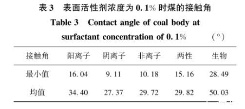以接觸角作為判斷潤濕的標準,接觸角越小則潤濕性能越好。表面活性劑濃度為0.1%時,煤巖接觸角統(tǒng)計結果見表3。當活性劑水溶液濃度為0.1%時,陰離子表面活性劑AES水溶液與煤的接觸角最小為9.11°。進一步將不同類型表面活性劑水溶液在濃度為0.1%時與煤的接觸角進行均值化處理可發(fā)現,陽離子、陰離子、非離子、兩性及生物表面活性劑水溶液與煤的接觸角平均值分別為34.4°、27.37°、29.72°、29.82°和50.03°。因此,表面活性劑潤濕性效果排序為:陰離子表面活性劑>非離子表面活性劑>兩性表面活性劑>陽離子表面活性劑>生物表面活性劑。