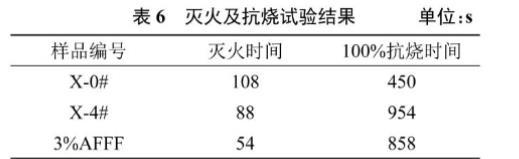 X-4#樣品泡沫具有高泡沫穩(wěn)定性,在以下研究中,著重研究X-4#與X-0#、3%AFFF相比的滅火及抗燒性能,測得的滅火時(shí)間及100%抗燒時(shí)間見表6。根據(jù)GB 15308—2006規(guī)定,滅火時(shí)間小于180 s,抗燒時(shí)間高于600s的泡沫被認(rèn)為具有成為消防泡沫滅火劑的潛力,X-4#樣品滅火時(shí)間88s、抗燒時(shí)間954 s,抗燒時(shí)間優(yōu)于3%AFFF,滅火時(shí)間比3%AFFF略高,但滿足消防用泡沫滅火劑性能要求,具有良好的消防滅火應(yīng)用潛力。