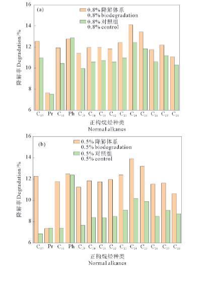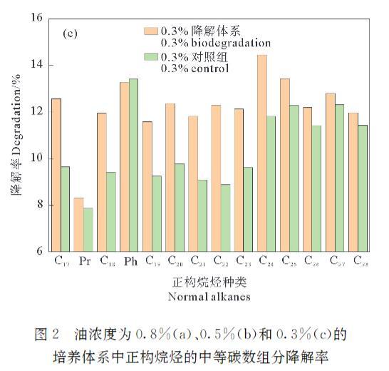 圖2油濃度為0.8%(a)、0.5%(b)和0.3%(c)的培養(yǎng)體系中正構(gòu)烷烴的中等碳數(shù)組分降解率