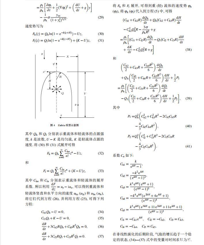 RT不穩(wěn)定性大致可以分為三個(gè)階段:早期線性增長階段、非線性增長階段和湍流混合階段。在早期階段,微擾振幅增長率呈指數(shù)增長,這一點(diǎn)人們已經(jīng)達(dá)成共識(shí)。當(dāng)微擾振幅和波長可以比擬時(shí),非線性發(fā)生,此時(shí)重流體以尖釘?shù)男问皆谳p流體中演化,而輕流體則以氣泡的形式在重流體中上升。在非線性增長的后期,氣泡和尖釘則是以恒定的速度增長。為了描述這一階段的演化,歷史上曾出現(xiàn)兩種主要的理論模型,一種是Layzer模型,另一種是Zufiria模型。1955年Layzer建立了適用于氣泡頂端附近的勢流模型,被稱之為Layzer模型。Zhang后來對(duì)該模型的速度勢進(jìn)行了修改。Goncharov、Sohn等人分別提出了新的速度勢,將Layzer模型推廣并應(yīng)用于任意密度比情形。1988年Zufiria提出了另一種理論模型,該模型假想在氣泡的下面存在一個(gè)點(diǎn)源,又稱點(diǎn)源模型。Zufiria模型的速度勢是復(fù)數(shù),而Layzer模型的速度勢是實(shí)數(shù)。Zufiria模型的運(yùn)算過程比Layzer模型復(fù)雜。早期Zufiria模型也只適用于無限密度比情形。后來Sohn將其推廣并應(yīng)用于任意密度比情形。