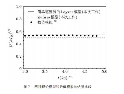 最后,我們將兩種理論模型的結(jié)果與數(shù)值模擬進(jìn)行了比較,如圖7所示。在誤差允許的范圍內(nèi),Zufiria模型和Layzer模型與數(shù)值模擬符合的都很好。由簡單速度勢的Layzer模型得出的結(jié)果更接近于數(shù)值模擬。另外,從圖7中還可以看出,簡單速度勢的Layzer模型計(jì)算值比數(shù)值模擬結(jié)果高,而Zufiria模型比數(shù)值模擬低。這可能由于Zufiria模型假設(shè)速度勢是復(fù)數(shù)勢,會(huì)人為引進(jìn)速度的耗散,導(dǎo)致結(jié)果比數(shù)值模擬低,而Layzer模型的計(jì)算值略高于數(shù)值模擬的原因可能由于數(shù)值模擬沒有達(dá)到漸近速度。