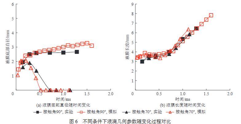 為進(jìn)一步驗(yàn)證本模型計(jì)算結(jié)果的可靠性,依據(jù)BANITABAEI等在實(shí)驗(yàn)中設(shè)置的不同碰撞條件,開展了相應(yīng)的數(shù)值模擬。如圖5b和圖5c所示,在不同碰撞條件下,數(shù)值模擬結(jié)果中的液滴形變過程與實(shí)驗(yàn)結(jié)果均具有較高的吻合度。圖6對(duì)比了數(shù)值模擬結(jié)果與實(shí)驗(yàn)結(jié)果中液滴幾何尺寸的變化過程,也具有較高的吻合度。其中,圖6a所展示的液膜底部直徑隨時(shí)間變化曲線,數(shù)值模擬結(jié)果與實(shí)驗(yàn)結(jié)果稍有偏差,原因是實(shí)驗(yàn)中固定顆粒的支撐柱對(duì)液膜底部的形變過程產(chǎn)生了一定影響。綜上所述,可認(rèn)為筆者構(gòu)建的數(shù)值模擬模型合理,結(jié)果具有較高可靠性。由于在毫米尺度下和微米尺度下,液滴與固體顆粒的碰撞過程均遵守經(jīng)典牛頓力學(xué)定律和經(jīng)典流體力學(xué)理論,所以本數(shù)值模擬模型可用于微米尺度下的其他工況條件的數(shù)值模擬研究。
