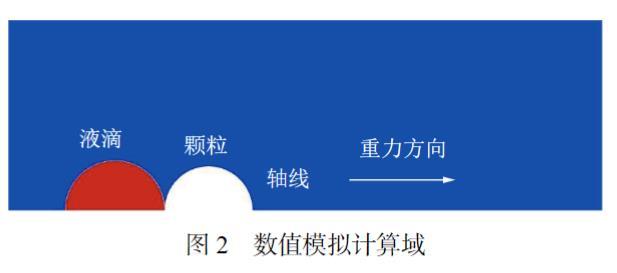 如圖2所示,液滴與顆粒對(duì)心碰撞時(shí),流場(chǎng)在演變過程將始終保持軸對(duì)稱狀態(tài),因此設(shè)置了二維軸對(duì)稱計(jì)算域。在相同的網(wǎng)格數(shù)量條件下,二維軸對(duì)稱計(jì)算域相較于三維計(jì)算域具有更好的網(wǎng)格質(zhì)量和計(jì)算精度。在分析計(jì)算結(jié)果時(shí),可以通過鏡像操作得到中軸線截面上的整體流場(chǎng)圖像。由于實(shí)驗(yàn)中最大雷諾數(shù)的數(shù)量級(jí)為104,因此,依據(jù)PASANDIDEH-FARD等的研究結(jié)果,可認(rèn)為在塵?霧碰撞過程中流場(chǎng)處于層流狀態(tài)。
