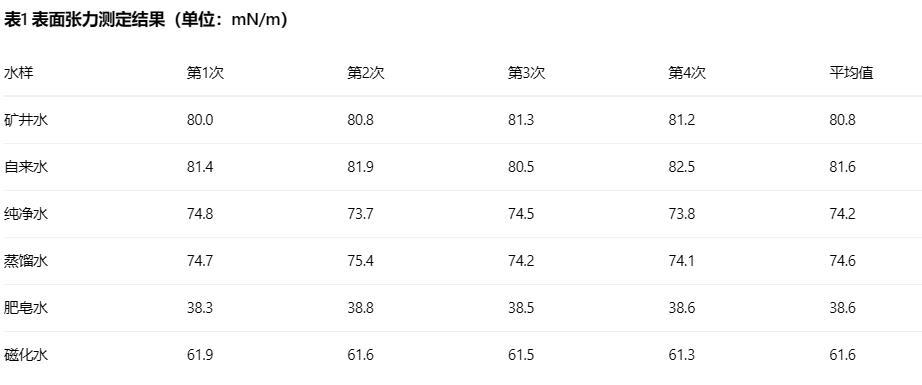 采用芬蘭Kibron公司生產(chǎn)的Delta-8全自動高通量表面張力儀對不同種類的水在室溫下進行測定,鉑金環(huán)浸入到水中一定的位置,隨著鉑金環(huán)與水之間的膜被拉長,使鉑金環(huán)受到一個向下的力,差動變壓器的磁芯隨鉑金環(huán)的下降而上升,使差動變壓器的線圈感應出一定的電壓值,這樣將被拉伸的薄膜變形量轉化為電壓量,經(jīng)微機處理轉化為相應的張力值,并自動顯示出來。隨薄膜逐漸被拉長,張力值逐漸增大,直至薄膜破裂,記下的最大值即水的實時張力。