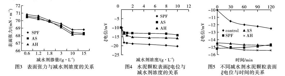 從圖3可知,SPF、AS和AH3種高效減水劑溶液的表面張力隨著高效減水劑濃度的增大而減小,SPF減水劑能降低水的表面張力,但沒(méi)有AS、AH降低得多,其主要原因是AS、AH在氣液界面的取向能力大且對(duì)混凝土有一定的引氣作用,而SPF不能明顯降低溶液表面張力,其對(duì)水泥顆粒分散作用中濕潤(rùn)作用貢獻(xiàn)較小。