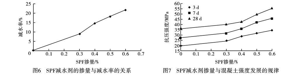 c.SPF高效減水劑應(yīng)用性能研究表明,隨著摻量的增大,減水率有成比例增加的趨勢(shì),低摻量下即具有較強(qiáng)的減水分散效果,繼續(xù)增加摻量后減水率處于平緩狀態(tài)。摻加SPF高效減水劑對(duì)混凝土有明顯的增強(qiáng)作用,隨著減水劑摻量的增加,不同齡期的抗壓強(qiáng)度都在增加,同時(shí)混凝土早期強(qiáng)度發(fā)展很快,3d的強(qiáng)度可達(dá)到28d強(qiáng)度的60%—70%,7d強(qiáng)度可達(dá)到28d強(qiáng)度的80%—90%,混凝土后期強(qiáng)度也有增長(zhǎng)的趨勢(shì)。