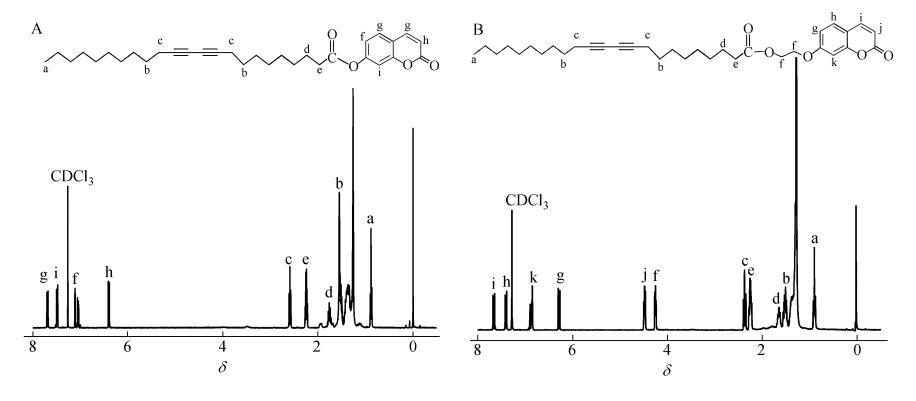 2類香豆素取代二乙炔單體參照文獻所述方法合成,分子結構及產物核磁譜圖如圖1所示。將2種產物分別溶于氯仿,配成1mg/mL的溶液。亞相為超純水(18.2MΩ·cm)。所有的π-A曲線和LB膜拉制實驗均為20℃條件下在KSV Mini-trough LB膜儀上進行。溶劑充分揮發(fā)后,膜障以5 mm/min的速率對其壓縮,在20℃和恒定膜壓35 mN/m下以2mm/min速率沉積Y-型LB膜?;瑸槭⑵?。薄膜的聚合是在16W的紫外燈(波長254nm)輻照下完成的,薄膜表面距離燈管下緣10cm,輻照時間5min。