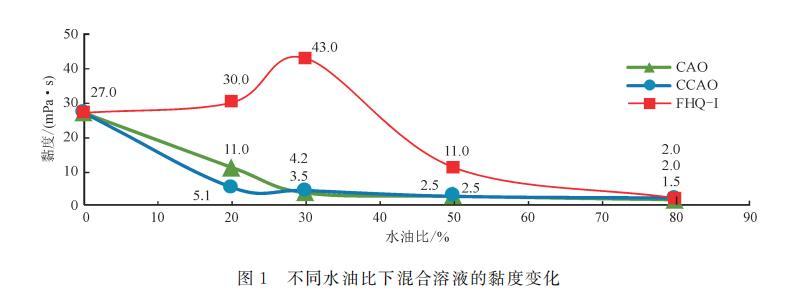 將CAO、CCAO和FHQ-I分別與現(xiàn)場采集的黏度約為27mPa·s的原油進(jìn)行混合,配置成200ml混合溶液,用六速旋轉(zhuǎn)黏度計(jì)在200r/min的條件下,對水油比分別為20%、30%、50%和80%的混合溶液的黏度進(jìn)行測量,結(jié)果如表3和圖1所示。
