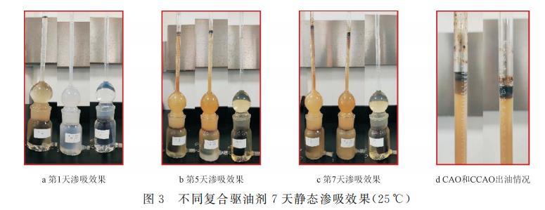 將巖心在110℃下烘干,稱重;將飽和好油的巖心置于阿莫特密封瓶(Amott cell瓶)中,分別加入試樣溶液(CAO、CCAO或FHQ-I的標(biāo)準(zhǔn)溶液)至略超過Amott cell瓶的最低刻度處,在25℃環(huán)境中,觀察并記錄其出油體積,通過計(jì)算得到的結(jié)果見表5,同時(shí)觀察不同時(shí)間飽和巖心滲吸出的原油形態(tài)(如圖3所示)。