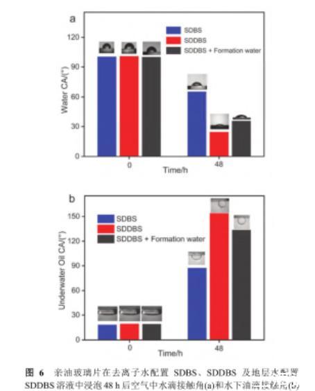 親油處理后玻璃片的空氣中水滴接觸角為100.2°,水下油滴接觸角為19.2°,為疏水親油性質.將親油玻璃片分別浸泡在0.02%(w)去離子水配置的SDBS、SDDBS溶液和地層水配置的SDDBS溶液中48 h,使用接觸角測量儀分別測量不同處理時間下其水滴接觸角及水下油滴接觸角.結果如圖6所示.SDDBS潤濕性調控能力較SDBS有較大提升,處理后空氣中水滴接觸角由65.1°降至24.5°,水下油滴接觸角由87.3°升至153.9°.經(jīng)SDDBS處理后的玻璃片呈現(xiàn)親水/水下強疏油性質.為探究鹽對界面潤濕調控性能的影響,使用地層水配置的SDDBS溶液處理親油玻璃片,結果表明處理后空氣中水滴接觸角為35.6°,水下油滴接觸角為133.6°,說明地層水的引入降低了SDDBS對親油表面的親水疏油調控效果.這是由于地層礦化度條件下,SDDBS分子鏈團聚影響界面吸附,導致潤濕調控能力略有下降.