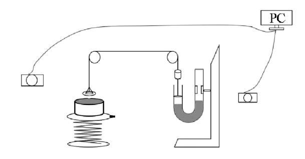 圖4為該實(shí)驗(yàn)裝置設(shè)計(jì)圖。該定量實(shí)驗(yàn)材料有U型管、砝碼(與金屬吊環(huán)一樣重)、活塞(與U型管內(nèi)徑相吻合且質(zhì)量極小)、定滑輪、升降臺(tái)和水槽、兩個(gè)數(shù)碼相機(jī)。其中一個(gè)相機(jī)用于錄像U型管示數(shù)變化,另一個(gè)相機(jī)用于觀察吊環(huán)形成水膜的狀態(tài)。最終兩個(gè)相機(jī)的圖像傳輸至PC端便可準(zhǔn)確讀出水膜在對應(yīng)狀態(tài)下U型管液面高度的示數(shù)。