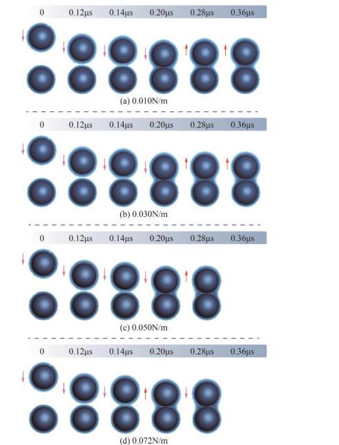 針對表面液膜厚度為0.15Rp、碰撞初速度為10m/s、表面張力系數(shù)為0.01~0.072N/m的濕顆粒碰撞過程進(jìn)行了詳細(xì)的數(shù)值模擬。如圖5所示,不同表面張力系數(shù)影響了液橋形態(tài)的演化規(guī)律。在0.14μs時,具有不同表面張力的濕顆粒同時接觸液膜,隨后在液體分子相互作用力的推動下,液膜流動迅速并填充進(jìn)顆粒間的間隙,形成穩(wěn)定的液橋。碰撞后,顆粒1反彈向上,拉伸液橋使其變高變細(xì),最終顆粒上升到最高點時,動能被完全消耗,被液橋重新拉回液膜表面,實現(xiàn)兩顆粒的聚并。當(dāng)表面張力系數(shù)為0.01N/m時,顆粒向上反彈的高度更加明顯,回落后與下方顆粒再次碰觸反彈,最終在0.46μs時聚并。隨著表面張力的增加,顆粒反彈時的速度衰減更快,液橋更快地將其拉回液膜表面。