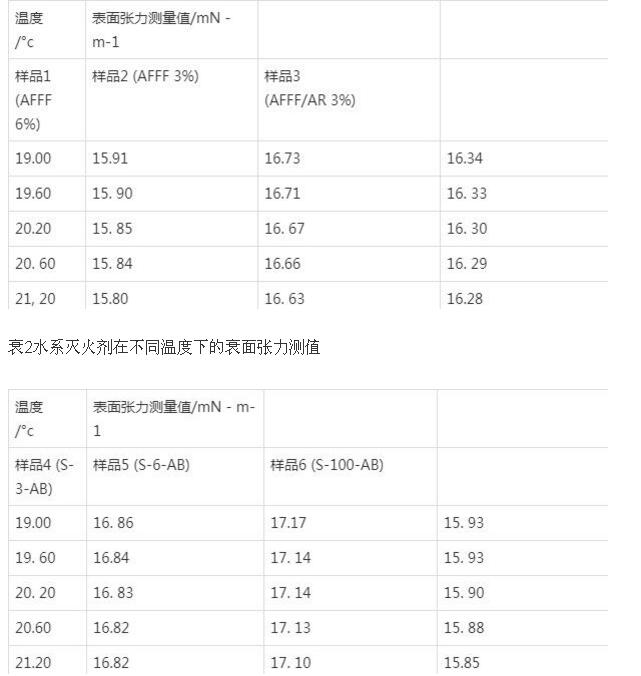 溫度條件對(duì)于液體表面張力存在著很大的影響。大 量試驗(yàn)數(shù)據(jù)表明,液體的表面張力會(huì)隨著溫度的升高而 降低。通過(guò)對(duì)一系列流體滅火劑產(chǎn)品,包括不同配比的 泡沫滅火劑(成膜型)、水系滅火劑等樣品進(jìn)行測(cè)試,可以 清晰地從表1、表2中看出,溫度的變化對(duì)流體型滅火剤 的表面張力存在一定程度的影響。