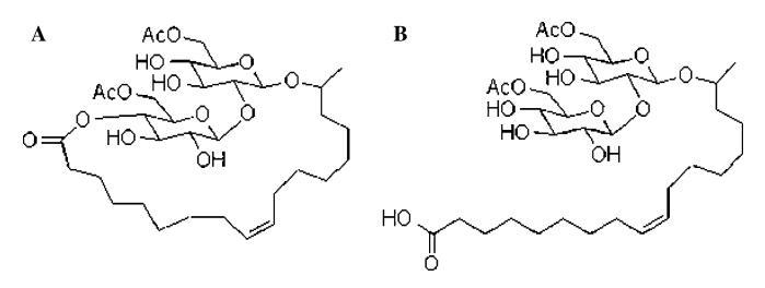 圖1(a)10400內(nèi)酯和(b)游離酸形式的17-L-[20-O-b-吡喃葡萄糖基-b-D-吡喃葡萄糖基)-氧]-9-十八烯酸60600二乙酸酯槐脂的結構