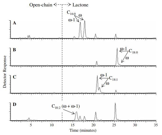 在4個SL中,只有一個SL-p的x-連桿總數(shù)大于x-1-連桿。 具體而言,在75%的棕櫚酸殘基中,39%通過x位置連接,36%通過x-1位置連接。 在其他情況下,大部分(至少71%)的脂肪酸通過x-1位置結(jié)合(亞油酸在所用LC方法下不可溶解,因此被報告為x和x-1組合結(jié)構(gòu))。 這些結(jié)果表明,為了形成內(nèi)酯,糖苷鍵和酯鍵之間必須至少有15個甚至17個碳單元。 SL-o和SL-s中對x-1連接的極大偏好表明17個碳是內(nèi)酯形成的首選碳。 然而,通過將棕櫚酸連接到x碳處的SL,鏈長度增加了1個碳單元(鍵間16個碳),使得內(nèi)酯的形成比連接到x-1碳(鍵間15個碳)時更有利。 SL-p中存在C17:0脂肪酸含量較低(3%)的SLs進一步證實了這一點,而SL-s、SL-o和SL-l中沒有C17:0脂肪酸夾雜的跡象。 根據(jù)這些數(shù)據(jù)和二乙?;瘍?nèi)酯分布(見表2),得出結(jié)論,對于SL包裹體測試的單個脂肪酸,其優(yōu)先順序為油酸、硬脂酸、棕櫚酸和亞油酸,以及C18脂肪酸, 單原子飽和優(yōu)于飽和和雙不飽和。