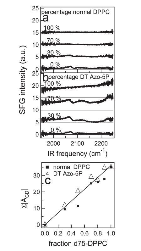 圖9。 (a) 正常DPPC和d75 DPPC不同混合物的CD區(qū)VSFG光譜。 圖中給出了混合物中正常DPPC的百分比。 為清晰起見,光譜偏移,細(xì)線表示零。 (b) 與a部分類似,但適用于DT Azo-5P與d75 DPPC的混合物。 (c) 通過擬合文中描述的VSFG光譜獲得的CD振動振幅之和,作為含正常DPPC或DT Azo-5P的二元混合物中分?jǐn)?shù)d75 DPPC的函數(shù)。 在本實驗中,為了獲得混合物的高質(zhì)量數(shù)據(jù),IR通量很高,導(dǎo)致通過VSFG光譜中相對較高的CH2和CD2振幅觀察到的脂質(zhì)尾部出現(xiàn)小的無序。