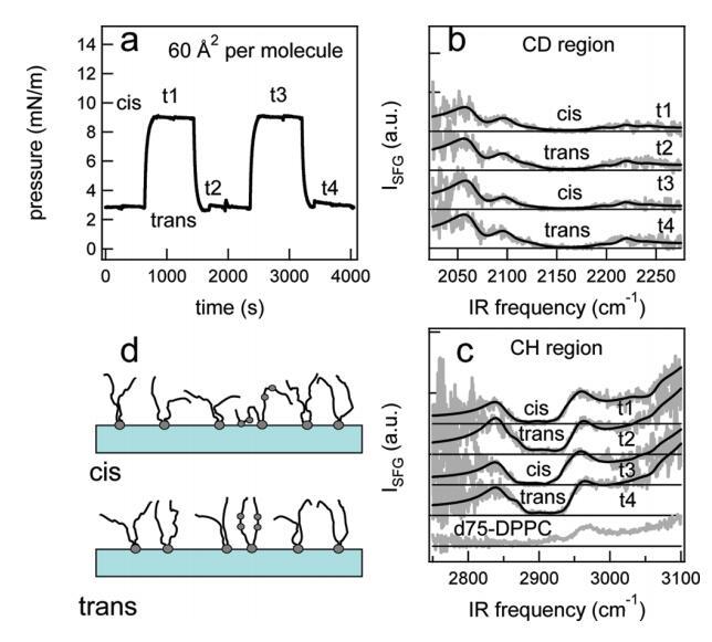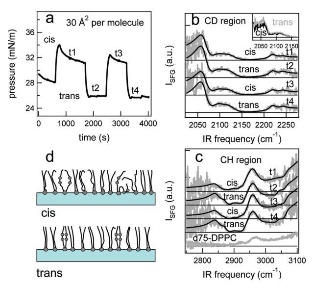 圖7。在脂質(zhì)/H2O界面處,DT Azo-5P/d75 DPPC的1:5混合物的結(jié)果,每個分子的面積為30?2。(a) 表面壓力與時間的關(guān)系。用370和450 nm光照射~100秒分別產(chǎn)生順式(高壓)和反式(低壓)狀態(tài)。壓力的微小劇烈波動是由于樣品高度的變化,以校正水的蒸發(fā)。順式狀態(tài)下表面壓力的降低可能是由于單層的松弛或膠束或囊泡的形成減少了表面脂質(zhì)的數(shù)量。(b) 相應(yīng)的VSFG光譜(灰色)以及CD區(qū)域的擬合。為了清晰起見,光譜已被抵消。插圖顯示了相互重疊的反式和順式光譜,以強(qiáng)調(diào)差異。(c) VSFG光譜(灰色)以及用于引導(dǎo)眼睛進(jìn)入CH區(qū)域的擬合。底部曲線顯示了在P時純d75 DPPC的光譜~ 40百萬/米。(d) 脂質(zhì)尾部方向的示意圖。光開關(guān)脂質(zhì)的偶氮苯部分用灰色圓圈表示。