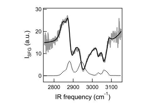 DT Azo-5P單分子膜的振動和頻發(fā)生光譜(VSFG)。圖3a描繪了在3 mN/m的表面壓力和75?2的分子面積下,處于反式狀態(tài)的光脂DT Azo-5P凝聚相的單層的灰色VSFG光譜。光譜顯示了CH2的共振(~2840 cm-1)和CH3對稱拉伸模式(~2860 cm-1),CH2和CH3不對稱拉伸模式~2890和2940 cm-1,以及3000 cm-1以上的芳香CH信號,源自偶氮苯部分。2,11-13 3100 cm-1以上,光譜主要由水亞相的OH振動控制。頻譜在低頻時有一個不尋常的高(非零)基線,這表明一個高非共振信號。為了檢查這種可能性,使用以下表達(dá)式擬合光譜:11,12