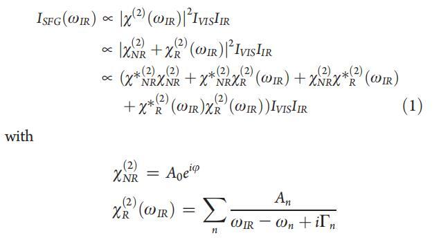共振項振幅的相對符號取自文獻(xiàn)。12,27,28擬合結(jié)果如圖3中黑色所示。事實上,擬合顯示DT Azo-5P的非共振振幅比通常觀察到的脂質(zhì)單層(如DPPC)的非共振振幅大3倍(見下文)。圖3a中的黑色虛線曲線說明了對信號的較大非共振貢獻(xiàn)的影響,該曲線表示使用DT Azo-5P共振響應(yīng)(從擬合結(jié)果獲得)的計算頻譜,但非共振振幅設(shè)置為零(水振幅被設(shè)置為零,從零開始,尾巴在CH區(qū)域也充當(dāng)NR信號)。當(dāng)NR振幅設(shè)置為零時,我們不僅觀察到背景降低,而且還觀察到視共振信號大小減小了2到5倍,具體取決于紅外頻率。通過測量羅丹明6G的VSFG光譜,我們觀察到了由于電子躍遷而產(chǎn)生的類似信號增強(qiáng)。29,30然而,在這種情況下ase作者使用可見光與電子激發(fā)共振,因此他們進(jìn)行了雙共振實驗。對于DT Azo-5P,在800 nm處沒有電子躍遷,因此沒有雙共振效應(yīng);增強(qiáng)完全是非共振的。因此,對于目前的系統(tǒng),非共振信號外差共振由χNR(2)和χR(2)的交叉項引起的nt信號(見等式1最后一行中的第二項和第三項),并增強(qiáng)信號而不是影響χR(2)如羅丹明6G.29,30所直接得出的結(jié)論,外差效應(yīng)因此不僅是分子內(nèi)的,而且是分子間的,并且可以直接用于增強(qiáng)高稀釋樣品中的低信號,例如,通過簡單地將含苯部分添加到單層中。這意味著VSFG光譜中的信號大小是在這種情況下,并不像在大多數(shù)非共振貢獻(xiàn)非常小的情況下那樣簡單地依賴于分子數(shù)量。在附錄中,我們證明,由于外差效應(yīng),在存在光脂的情況下,可以測量相對較低水平的DPPC。這種非共振外差效應(yīng)可能提供一種有用的去共振方法檢測分子單層中低濃度分子的振動響應(yīng)。