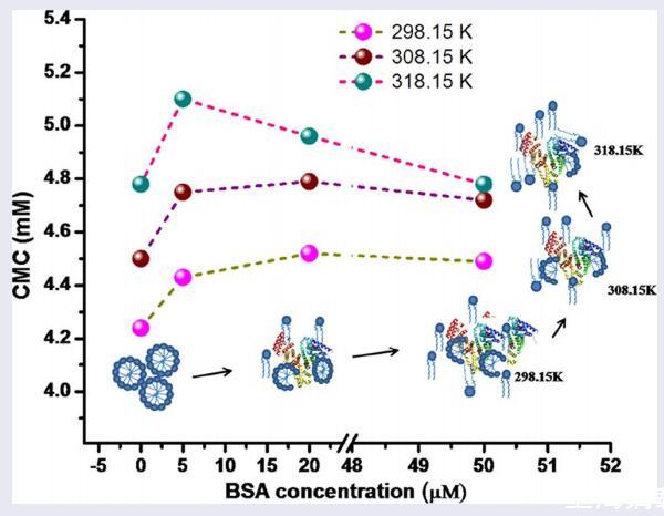 用表面張力法研究了牛血清白蛋白對IL型gemini表面活性劑[C10-4-C10im]Br2表面性質(zhì)的影響。研究了不同溫度下臨界膠束濃度(CMC)與BSA濃度的關(guān)系。[C10-4-C10im]Br2的CMC隨著BSA濃度的增加以及系統(tǒng)溫度的升高而增加。界面參數(shù),即;計算了最大表面過量濃度(Γmax)、每分子最小面積(Amin)和CMC下的表面壓力(ΔCMC)。此外,利用表面張力數(shù)據(jù)評估了吸附和膠束化的熱力學(xué)參數(shù)。結(jié)果表明,[C10-4-C10im]Br2與BSA的結(jié)合是自發(fā)的、放熱的。該過程是熵驅(qū)動的,疏水相互作用是主要驅(qū)動力。