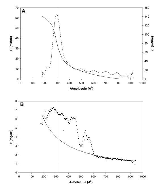 圖3 HFBII的代表性壓縮等溫線,壓縮量遠低于每個分子的面積。 (A) P(-)和E(---)與每個分子的面積的關(guān)系。 (B) 攤鋪量和壓縮(Gcomp,-)預(yù)期的表面載荷,并通過橢偏儀(Gell,A)測量。