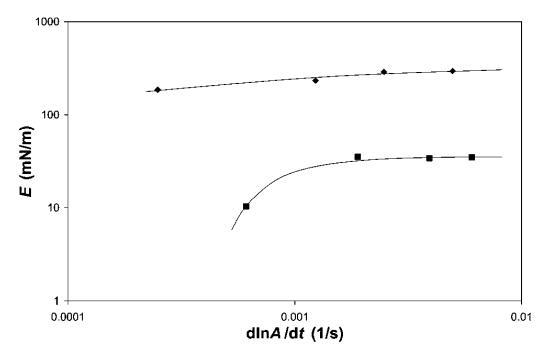 頻率依賴性。 為了評估其中一些系統(tǒng)中粘性損失的重要性,我們對b-lg和HFBII進行了頻率相關(guān)的表面膨脹流變。 對于表面膨脹流變學(xué),我們顯示了在18<P<22 mN m-1之間測量的小變形模量(見圖10)。 注意,變形率d(lna)/dt為0.0012 s 1對應(yīng)于5 mm min 1的勢壘速度,用于大變形實驗。 相比之下,歧化時間約為0.5小時,接近泡沫實驗觀察到的粗化時間。 HFBII的數(shù)據(jù)表明,在所研究的變形速率范圍內(nèi),變形速率對E的影響適中。 對于b-乳球蛋白,頻率的影響更為明顯,因此,在變形速率低于0.001 s 1時,可觀察到E的強烈下降。 這表明b-lg的粘性損失比HFBII更為明顯。 這一比較再次表明,b-lg的外觀更柔軟,壓縮/膨脹時解吸/吸附能力更強。
