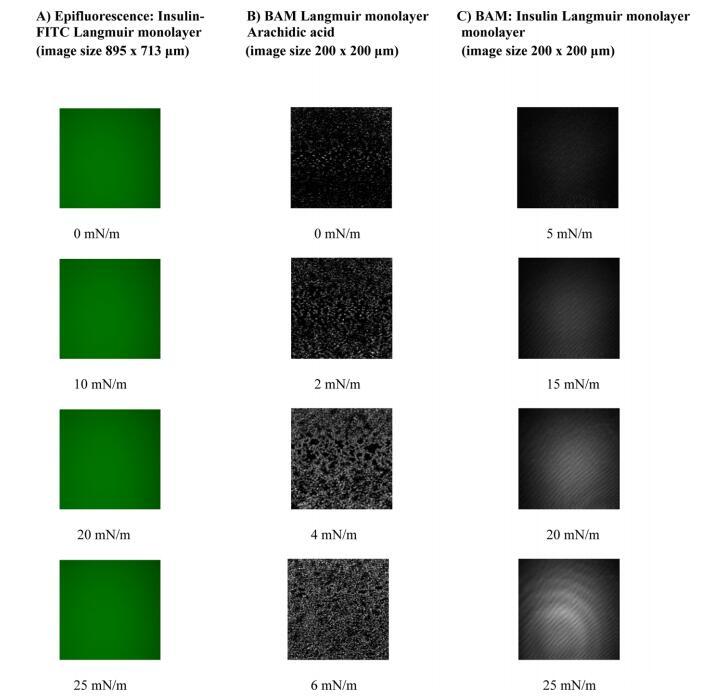 3.4. 人胰島素朗繆爾單層的表觀熒光和布魯斯特角顯微鏡觀察。 人胰島素Langmuir單層的形貌通過(guò)FITC人胰島素的表觀熒光進(jìn)行檢查,而布魯斯特角顯微鏡用于2-D純?nèi)艘葝u素。由于胰島素是非熒光的,因此必須附加熒光團(tuán)才能使用表觀熒光顯微鏡。 蛋白質(zhì)常用的探針是異硫氰酸熒光素(FITC)。