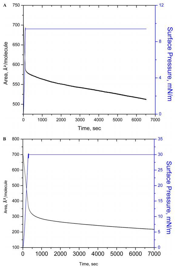 圖3.在亞相pH值5.6下,在表面壓力為10(A)和30 mN/m(B)的條件下,對(duì)人胰島素Langmuir單層膜進(jìn)行90 min的穩(wěn)定性測(cè)量。