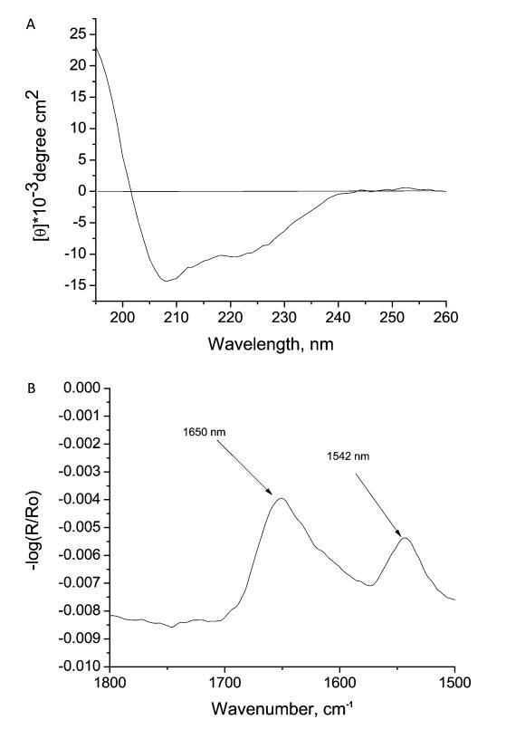 圖6。 (A) 在pH 2和溫度20±1°C條件下,水性胰島素的圓二色光譜和(B)FTIR光譜。胰島素濃度分別為0.3和2 mg-mL ? 分別為1。