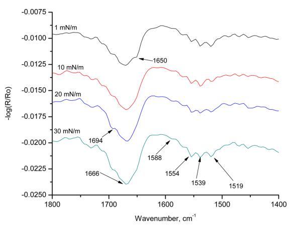給出了三種IRRAS光譜。 圖7顯示了不同表面壓力下60°的極化,圖8顯示了10 mN/m的恒定表面壓力和30到70°范圍內(nèi)的變化角度,圖9顯示了25°恒定角度和變化表面壓力下的s極化。 表2給出了α-螺旋和β-片的譜帶特征以及對(duì)應(yīng)于α-螺旋的酰胺I和酰胺II振動(dòng)。