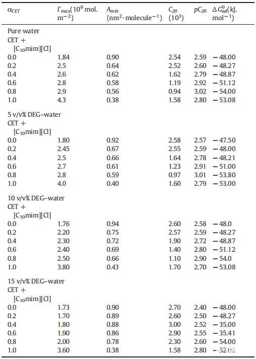 表4純CET、[C10min][Cl]和CET+[C10min][Cl]混合物的表面過剩(Γmax)、每分子最小面積(Amin)、吸附效率(pC20)和吸附自由能(ΔGad 0),作為純水中CET摩爾分?jǐn)?shù)α的函數(shù),并且在T=298.15K時(shí)存在不同體積百分比的二元DEG-水混合物。